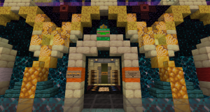 Spawn is broken up into several areas. The area players reach when running "/spawn", and the area new players spawn in, is the central spawn area. From here, players can take one of twelve drop downs to go to different content on the server. There are also areas accessible only from the central spawn area, reached by walking towards a corner of the area.